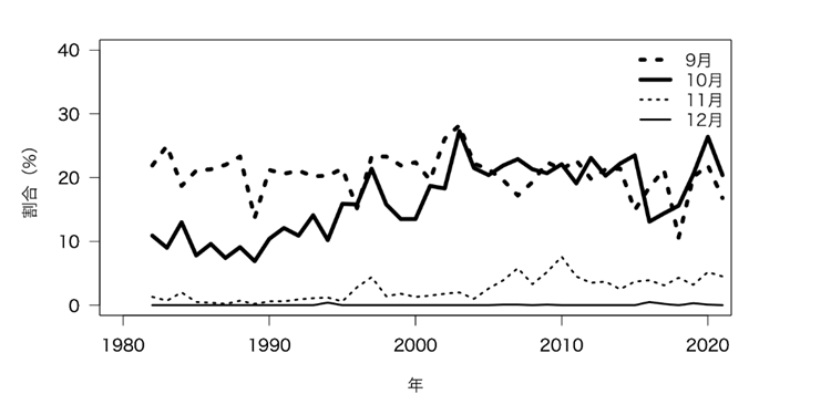 図1. 岐阜県産の天然アユに関する、年間総取扱量に対する10〜12各月の取扱量の割合(論文における図5(c)を改変して掲載)。