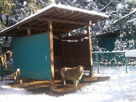 冬:避難小屋の中で雪を避ける羊